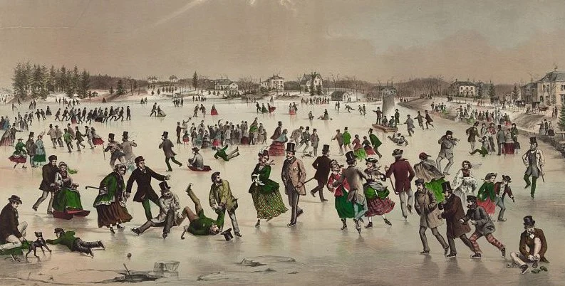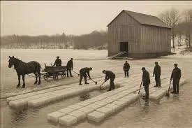 Ice harvesting in the 19th century — Jamaica Pond was known for producing some of the clearest, cleanest ice, which was cut in winter and stored in ice houses for local and even international use.